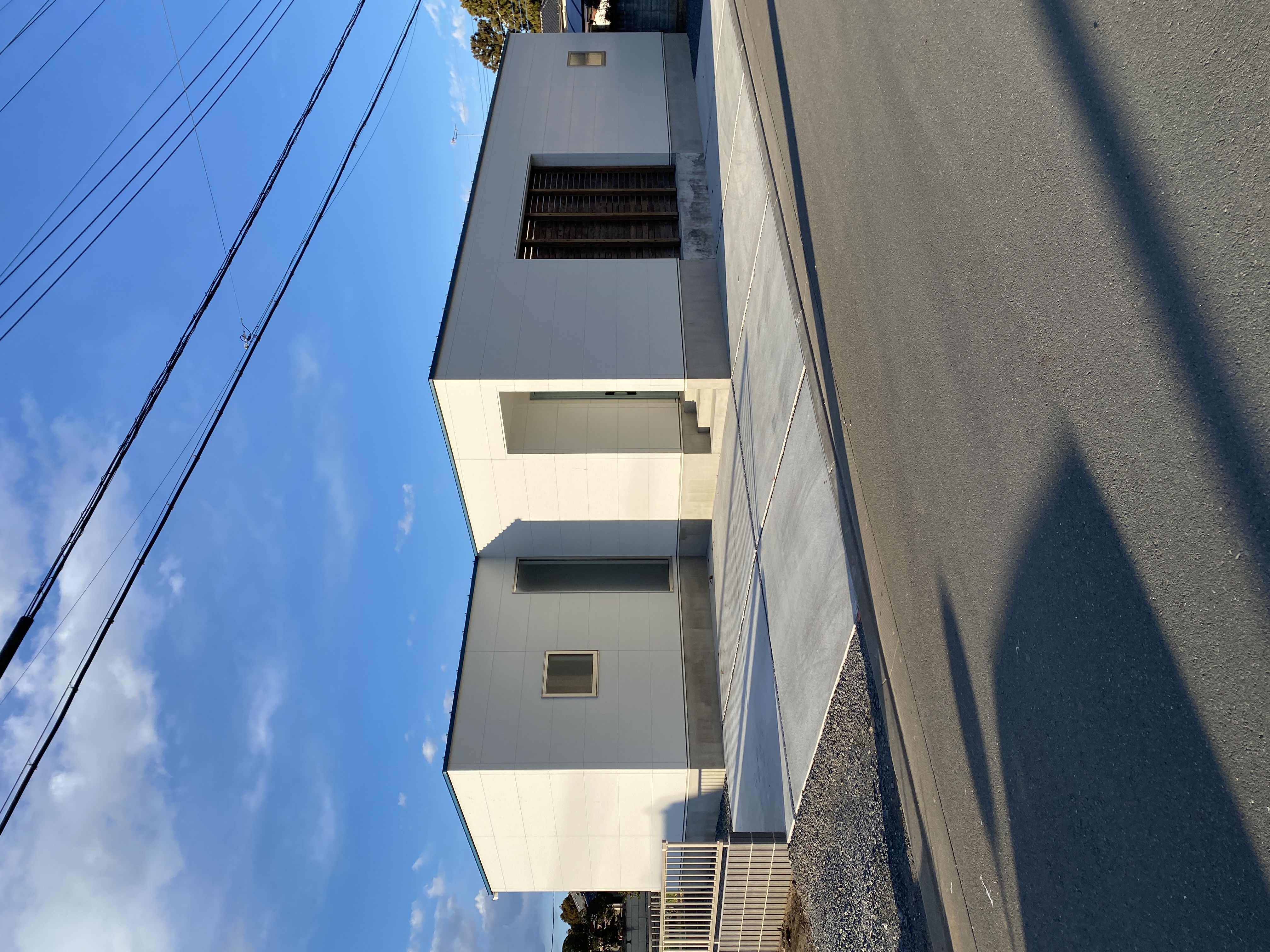 白い外壁に、青い屋根材。