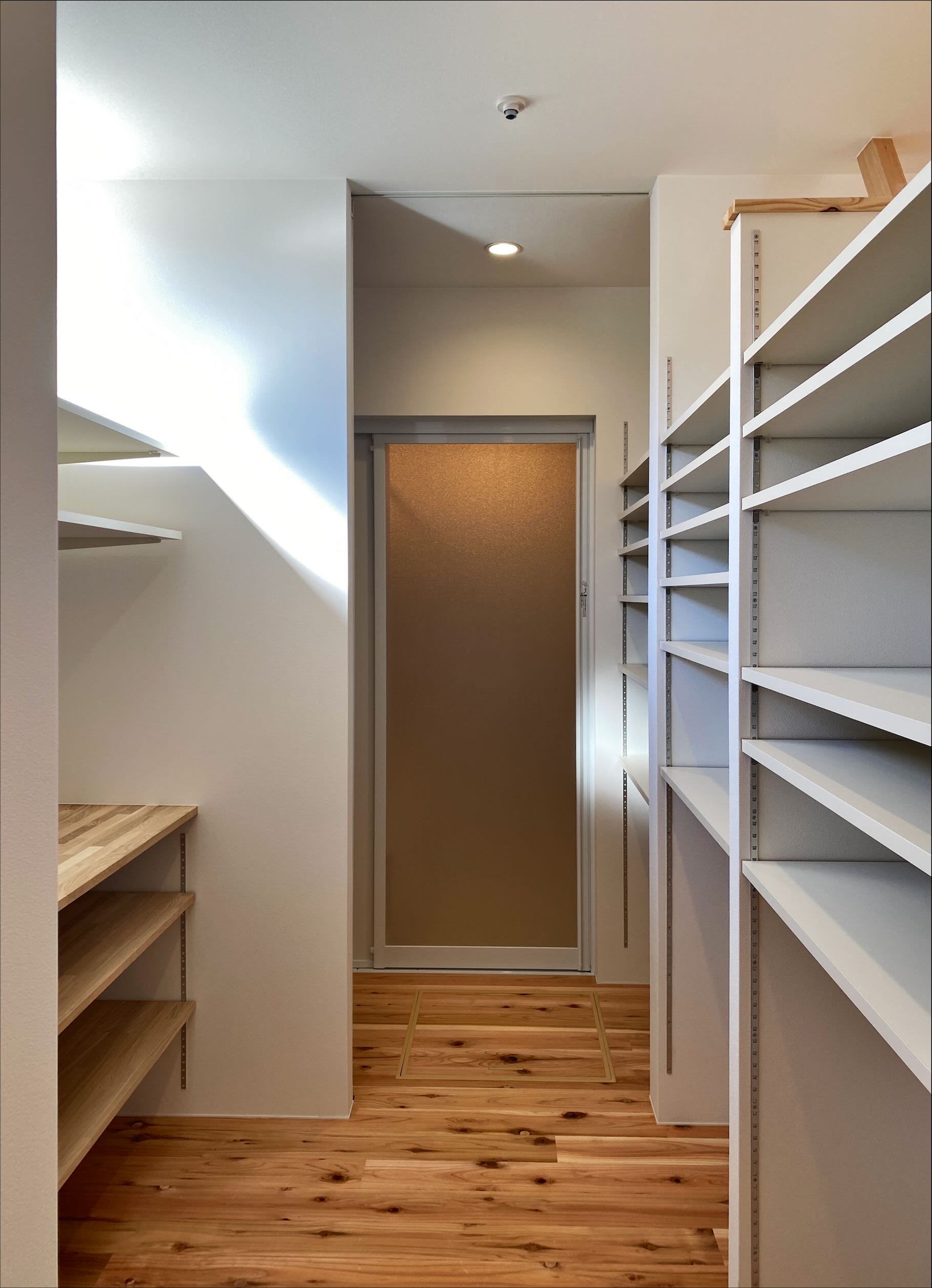 水廻り動線に沿っての壁面収納は、可動棚に