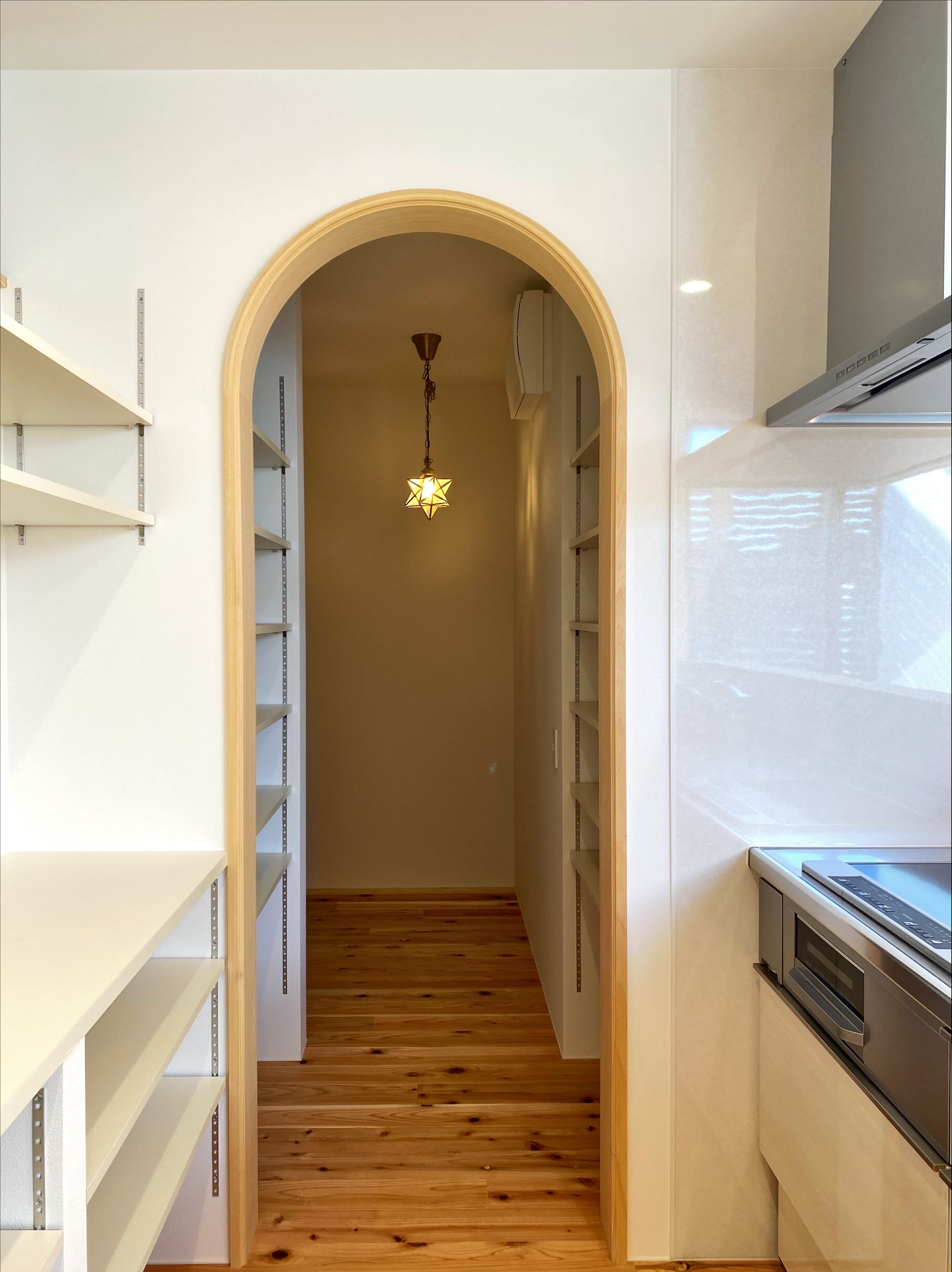 キッチン奥のパントリー入り口はR壁に。